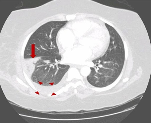 This patient with chronic obstructive pulmonary disease (COPD) and acute-onset shortness of breath, hypoxia, and unilaterally decreased breath sounds likely has a secondary spontaneous pneumothorax (SSP). SSP occurs in patients with known lung disease (eg, COPD, cystic fibrosis). Other common manifestations include chest pain and hyper-resonance on percussion. Cigarette smoking markedly increases the risk of pneumothorax. Chronic destruction of alveolar sacs leads to the formation of large alveolar blebs (red arrow), which can eventually rupture and leak air into the pleural space.