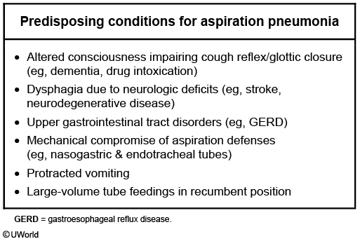 Patients with pulmonary abscesses will often be predisposed to aspiration pneumonia due to impaired epiglottic function and therefore inadequate airway protection. Commonly tested scenarios include: