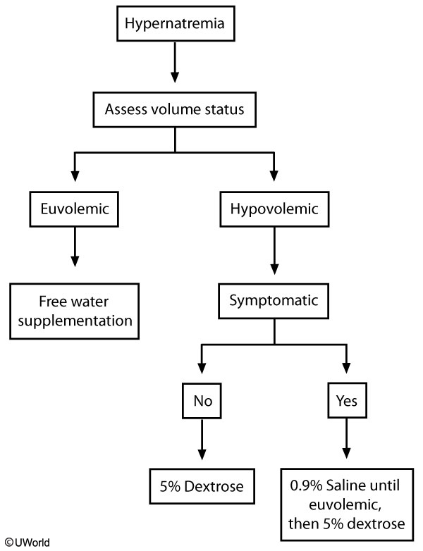 The first step is to restore volume with isotonic fluids (0.9% saline). Isotonic fluid is not usually used in hypernatremia, but it is recommended in patients with marked volume depletion and hemodynamic instability. Once the patient is euvolemic, the fluid can be switched to a hypotonic fluid (5% dextrose preferred over 0.45% saline) for free water supplementation. The serum sodium should be corrected by 0.5 mEq/dL/hr without exceeding 12 mEq/dL/24 hr. Cerebral edema can occur if the sodium is corrected too quickly.