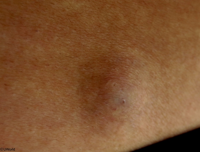 This patient has an epidermal inclusion cyst (EIC), also known as an epidermal cyst, a discrete benign nodule lined with squamous epithelium that contains a semisolid core of keratin and lipid. An EIC occurs when the epidermis becomes lodged in the dermis due to trauma or comedones, or it can arise de novo. EICs can be seen anywhere on the body, but are most common on the face, neck, scalp, or trunk. The lesion can gradually increase in size and may intermittently produce a cheesy white discharge. Some patients may develop significant inflammation with rupture and involvement of surrounding tissue. An EIC will usually resolve spontaneously but can recur.
