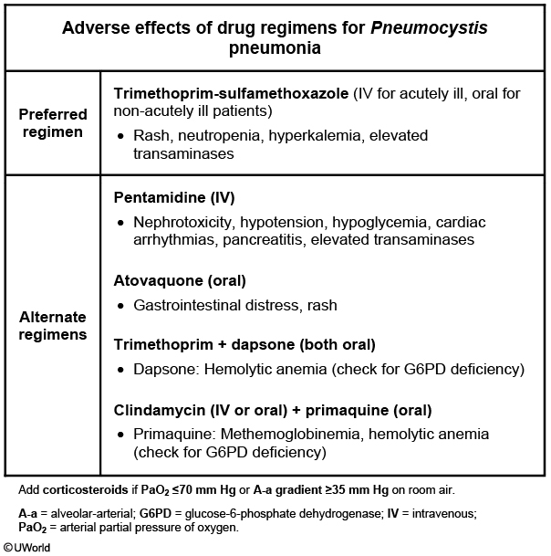 Trimethoprim-sulfamethoxazole (TMP-SMX) is the initial drug of choice for the treatment of PCP regardless of pneumonia severity. Treatment typically lasts for 21 days. Adjunctive corticosteroids have been shown to decrease mortality in cases of severe PCP (possibly by reducing inflammation due to dying organisms). Indications for corticosteroid use include partial pressure of oxygen (PaO2) <70 mm Hg or an alveolar-arterial (A-a) gradient >35 mm Hg on room air.