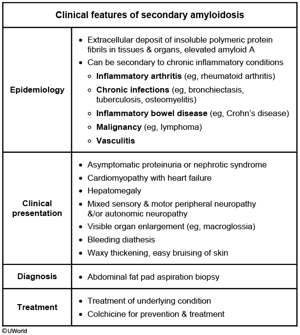 This patient's clinical presentation of facial swelling, bilateral lower-extremity edema, and massive proteinuria are consistent with nephrotic syndrome. The presence of nephrotic syndrome with palpable kidneys, hepatomegaly, and ventricular hypertrophy (suggested by an audible fourth heart sound) in the setting of chronic inflammatory disease (recurrent pulmonary infections, bronchiectasis) is suggestive of secondary amyloidosis (AA) as a common unifying diagnosis. Treatment is usually directed at the underlying inflammatory disease. Colchicine is approved for both the treatment and prophylaxis of AA.