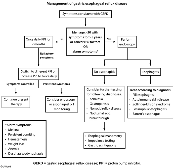 Tobacco use is a major risk factor for esophageal adenocarcinoma and squamous cell carcinoma; alcohol use is also an important risk factor for esophageal squamous cell carcinoma. Significant weight loss, rapid symptom onset (less than 6 months), and presentation at age >60 all increase the likelihood of malignancy (by comparison, patients with achalasia have symptoms for approximately 5 years before receiving a diagnosis, and they typically only have mild weight loss). Tumor metastasis (eg, mediastinal lymph nodes) or local involvement may give a radiologic appearance similar to that seen with a widened mediastinum. Endoscopic evaluation can differentiate between achalasia and pseudoachalasia. In achalasia, this evaluation usually shows normal-appearing esophageal mucosa and a dilated esophagus with possible residual material; in addition, it is generally possible to easily pass the endoscope through the lower esophageal sphincter (unlike in malignancy).