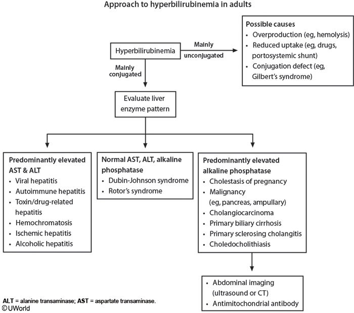 Unconjugated bilirubin (tightly bound to albumin) is highly insoluble, so it cannot be excreted in urine. Excess unconjugated bilirubin (eg, hemolysis) undergoes the regular conjugation pathway with eventual production of urobilinogen, and the resultant excess urobilinogen is primarily recycled; however, a higher than normal amount of urobilinogen is excreted in feces or urine, leading to a positive urine urobilinogen assay (not seen in this patient). On the other hand, conjugated bilirubin (loosely bound to albumin) is water soluble, so it can be excreted in urine. Despite this, no bilirubin is normally seen on urinalysis (negative urine bilirubin assay) because conjugated bilirubin is usually degraded in the intestines. However, when there is hepatic dysfunction, biliary obstruction, or a defect in hepatic bilirubin secretion (as in this patient), there is plasma buildup of conjugated bilirubin, which leaks into urine. This results in dark urine and a positive urine bilirubinassay.