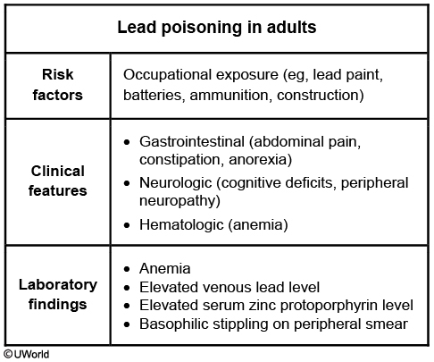 Nonspecific symptoms (eg, fatigue, irritability, insomnia) are common. Chronic lead exposure can also cause hypertension and nephropathy. Diagnosis hinges on eliciting a history of exposure through occupation (eg, battery manufacturing, plumbing, home restoration) or other means (eg, distillation of alcohol through parts with lead soldering).