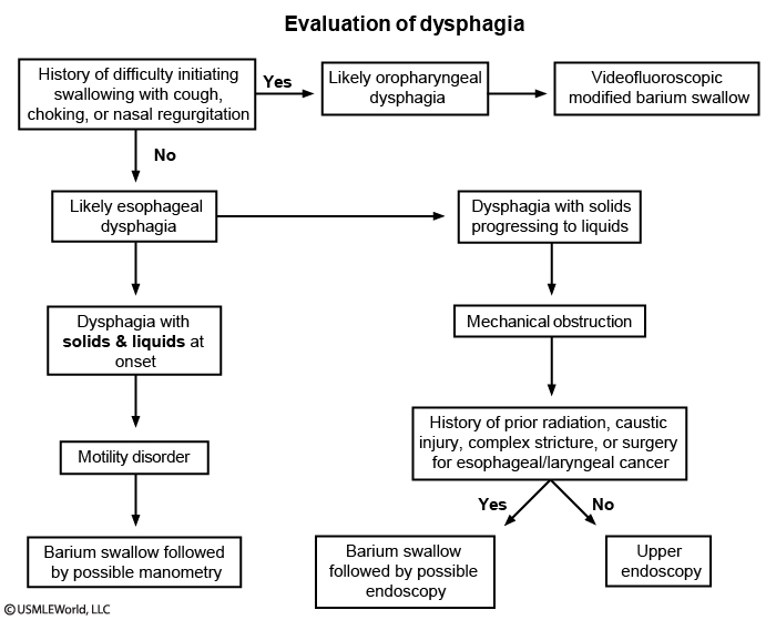 Dysphagia can be classified as oropharyngeal or esophageal. Oropharyngeal dysphagia presents with difficulty initiating swallowing due to inability to properly transfer food from the mouth to the pharynx. Underlying etiologies for oropharyngeal dysphagia can include stroke, advanced dementia, oropharyngeal malignancy, or neuromuscular disorders (eg, myasthenia gravis).