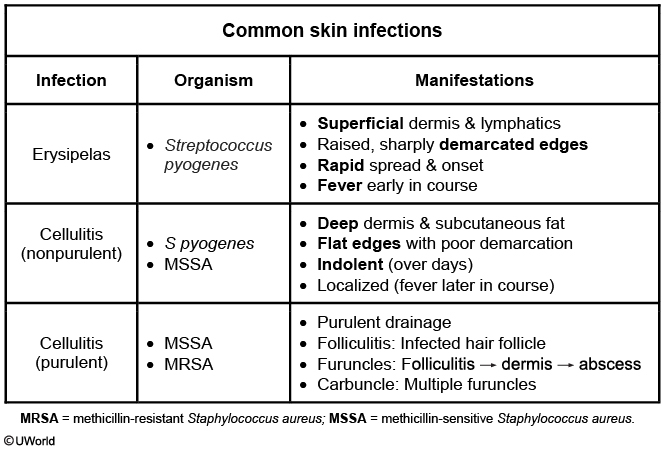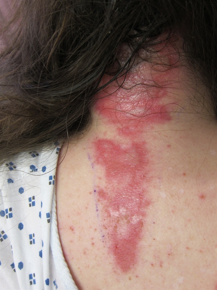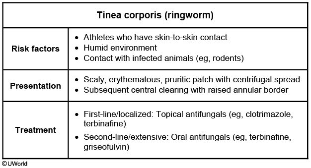 This patient has a pruritic rash with a scaly, erythematous border and central clearing consistent with tinea corporis (ringworm). Patches of tinea corporis are typically round or ovoid but may become confluent to form a "flower petal" shape. Skin contact, especially in warm and humid environments, is a common risk factor. Any species of dermatophyte may cause this condition, but Trichophyton rubrum is the most frequent culprit. Tinea corporis is often more extensive in patients with immunocompromising conditions (eg, HIV, diabetes mellitus).