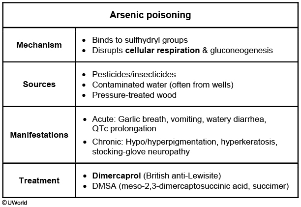 Arsenic is a metalloid element that exists in numerous forms, including both natural and manmade compounds. Although humans are often exposed to low levels through diet and water, toxic exposure is more likely through mining, pesticide manufacturing, metalworking, and working with antique pressure-treated wood preserved with arsenic. Arsenic binding to sulfhydryl groups and interfering with various enzymes is likely responsible for the clinical manifestations of acute and chronic arsenic toxicity.