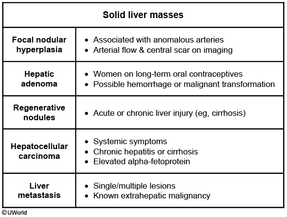 This young woman has a large, painful hepatic mass. She has elevated alkaline phosphatase and gamma glutamyl transpeptidase (GGT) levels, suggesting biliary compression or obstruction, but otherwise relatively normal liver markers. In light of her minimal alcohol consumption and long-term use of oral contraceptives, this likely represents a hepatic adenoma. Hepatic adenomas are benign epithelial tumors that are most common in young and middle-age women. Additional risk factors include anabolic androgen use and pregnancy.