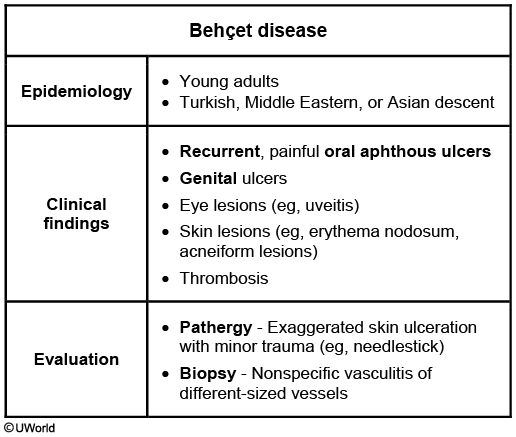 Behçet syndrome is more common in patients of Turkish, Middle Eastern, and Asian descent. The diagnosis is made based on clinical features, and laboratory evaluation is primarily directed to ruling out other disorders. Biopsy of affected tissues is not usually needed but may show a nonspecific vasculitis, often involving small or medium-sized vessels.