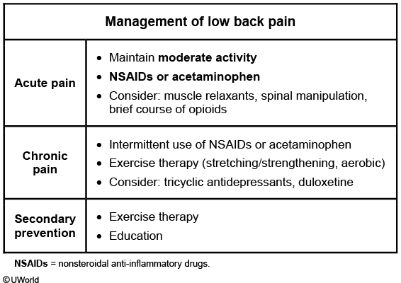 This patient has uncomplicated chronic (>12 weeks) low back pain (LBP). Patients with acute (<4 weeks) LBP should be advised to maintain moderate activity with short courses of acetaminophen or nonsteroidal anti-inflammatory drugs(NSAIDs) to provide pain relief. Most patients will have resolution without any additional intervention. However, those with subacute (4-12 weeks) or chronic LBP are more likely to continue to have recurrent or persistent pain.