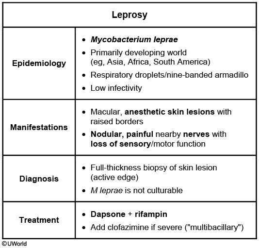 Leprosy is a chronic granulomatous disease of the skin and peripheral nerves caused by the acid-fast bacillus *Mycobacterium leprae*. Transmission is thought to occur via respiratory droplets, although cases are occasionally linked to close contact with a nine-banded armadillo. Infections are rare in the United States and occur primarily in immigrants or travelers to endemic regions (eg, Asia, Africa, South America).