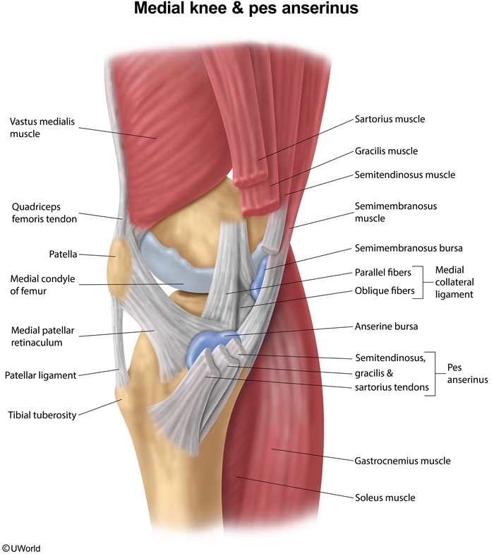 This patient with medial knee pain and focal tenderness has pes anserinus pain syndrome (PAPS). This condition is often referred to as anserine bursitis, but most patients do not have true inflammation in the bursa, and multiple regional structures can contribute to the pain. The pes anserinus is formed by the conjoined tendons of gracilis, sartorius, and semitendinosus. The anserine bursa is located anteromedially over the tibial plateau, just below the joint line of the knee and deep to the pes anserinus.