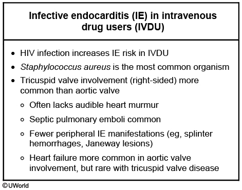 This patient's presentation (pulmonary symptoms, history of intravenous drug abuse with track marks, and cavitary lesions on imaging) suggests septic embolism from infective endocarditis (IE). HIV greatly increases IE risk in intravenous drug users (IVDU), most commonly at the tricuspid valve. Patients typically present with systemic symptoms (eg, fever, chills), pleuritic chest pain, dyspnea, and/or cough. However, there may not be a tricuspid valve murmur on cardiac examination due to the relatively low pressure gradient across the valve. Peripheral manifestations (eg, splinter hemorrhages, Janeway lesions) are also less common in patients with tricuspid valve disease.