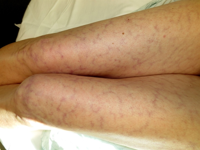 Clinical manifestations can be immediate or delayed (>30 days after inciting event). Atherosclerotic plaques in the aortic arch can embolize to the brain and cause cerebral infarction. Diffuse showering of emboli into the peripheral circulation can cause intestinal ischemia, gastrointestinal bleeding, pancreatitis, and acute kidney injury. Skin manifestations are the most common complication (34% of patients) and include "blue toe syndrome" (cyanotic toes with intact pulses), livedo reticularis (reticular, lacy skin discoloration/erythema that blanches on pressure), gangrene, and ulcers. Examination of the retina may show Hollenhorst plaques, bright, yellow, refractile plaques in the retinal artery, which indicate a proximal source such as the internal carotid artery.