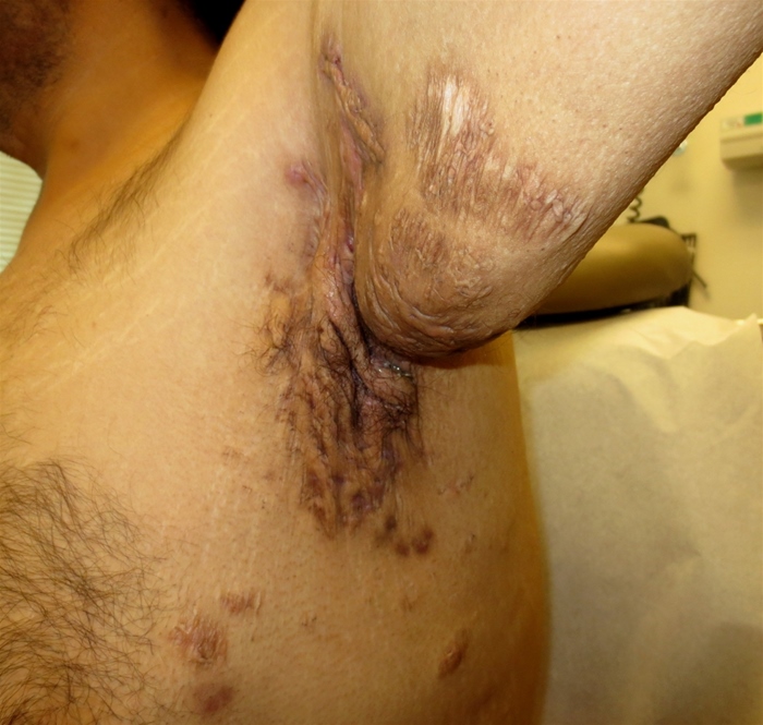 HS initially presents as solitary, painful, inflamed nodules that can last for several days to months. The nodules may regress or can progress to abscesses that open to the surface with purulent or serosanguineous drainage. Most patients have a chronic, relapsing course. Complications include sinus tracts, comedones, and scarring. Severe scarring can lead to dense, rope-like bands in the skin with strictures and lymphedema. The diagnosis of HS is usually made clinically without the need for biopsy or cultures.