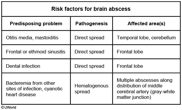 Contiguous spread may occur in sinusitis, otitis media, mastoiditis, or dental infections.