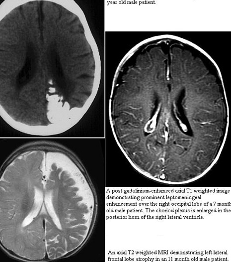 Some patients have an ipsilateral arteriovenous malformation of pia mater vessels (ipsilateral leptomeningeal angioma) overlying occipital and parietal lobes.