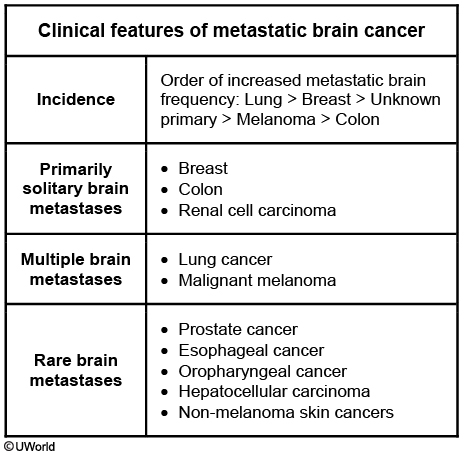 The most common mechanism of metastasis to the brain is hematogenous spread. Metastases are usually located directly at the junction of the gray matter and white matter where blood vessels decrease in diameter and trap tumor cells.