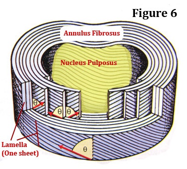 Central annular lamellae buckling inward while the external concentric bands of the annulus fibrosis bulge outward. This causes increased mechanical stress at the cartilaginous end plates.