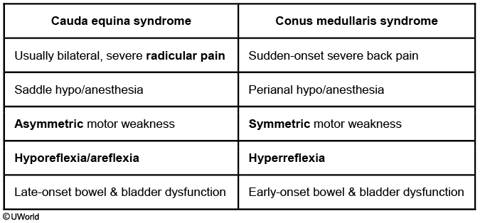 Urinary or fecal incontinence, new onset sexual dysfunction or saddle anesthesia are worrisome signs that need to be urgently addressed. The next step would be to obtain MRI and neurosurgical consult.