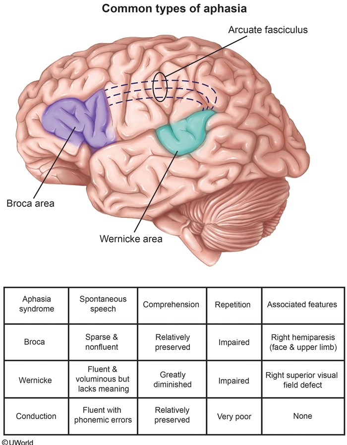 Conduction aphasia is the result of damage to the arcuate fasciculus, which connects Broca’s and Wernicke’s areas of the brain. This includes: