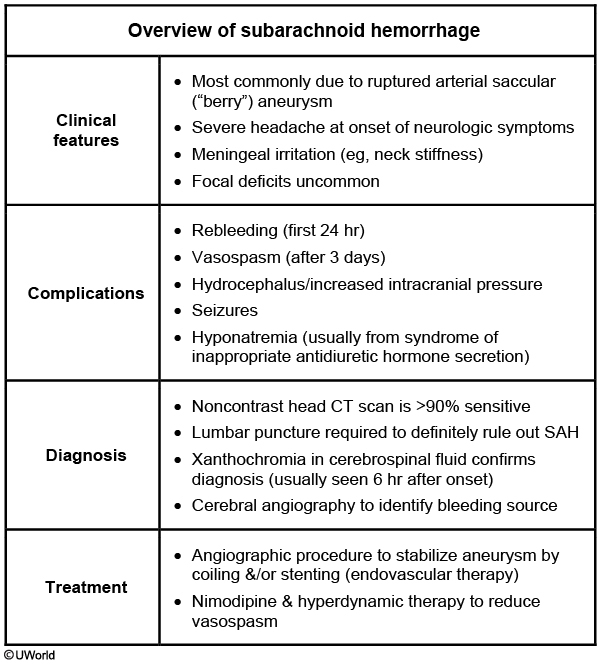Many patients who have a subarachnoid hemorrhage will present with the sudden onset of a severely painful headache (“worst headache of my life”). Thunderclap headache