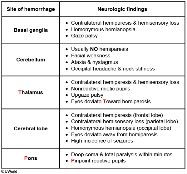 Patients with parenchymal hemorrhage present with focal neurologic symptoms (e.g. hemiplegia, homonymous hemianopsia) that are followed by manifestations of increased intracranial pressure (e.g. headache, vomiting). These manifestations intensify gradually over time.