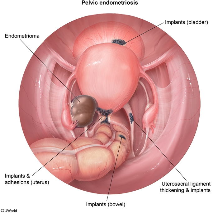 Endometriosis is an estrogen-dependent condition that affects reproductive-age women. Ectopic endometrial glands and stroma cause pain due to cyclic hemorrhage and accumulating fibrosis. Patients can be asymptomatic or develop dysmenorrhea, dyspareunia, and chronic pelvic pain that worsens before the onset of menses. Typical examination findings are tenderness of the recto-vaginal area, tenderness with movement of the uterus, and thickening of the uterosacral ligaments caused by endometrial implants on the recto-vaginal septum, pelvic peritoneum, anterior and posterior cul-de-sac, and uterosacral ligaments. Negative laboratory testing and normal ultrasound exclude other etiologies of chronic pelvic pain.