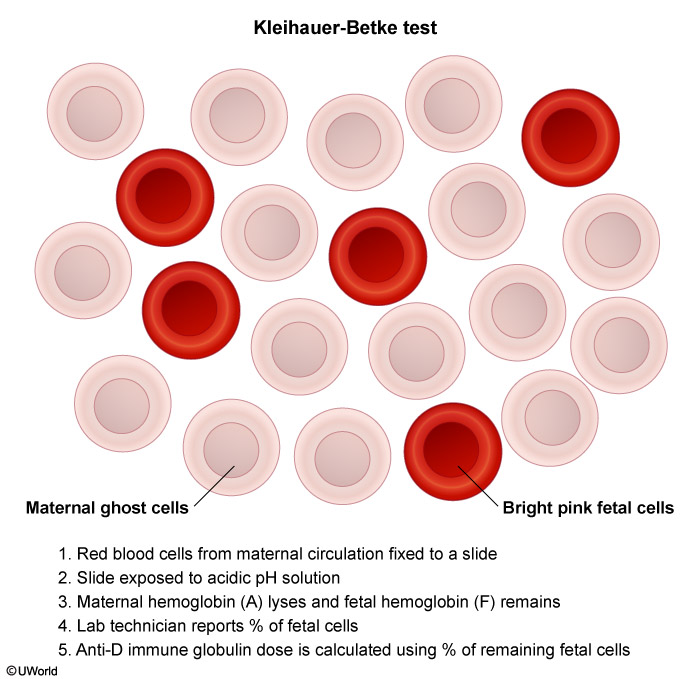 The Kleihauer-Betke (KB) test is commonly used to determine the dose. Red blood cells from the maternal circulation are fixed on a slide. The slide is exposed to an acidic solution and adult hemoglobin lyses, leaving "ghost" cells. The dose of anti-D immune globulin is calculated from the percentage of remaining fetal hemoglobin.