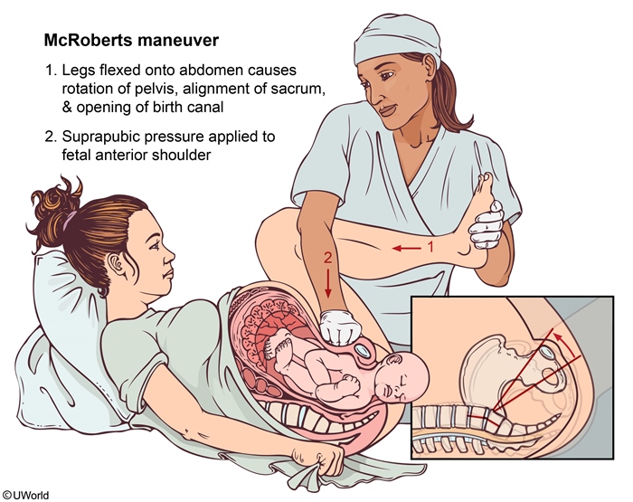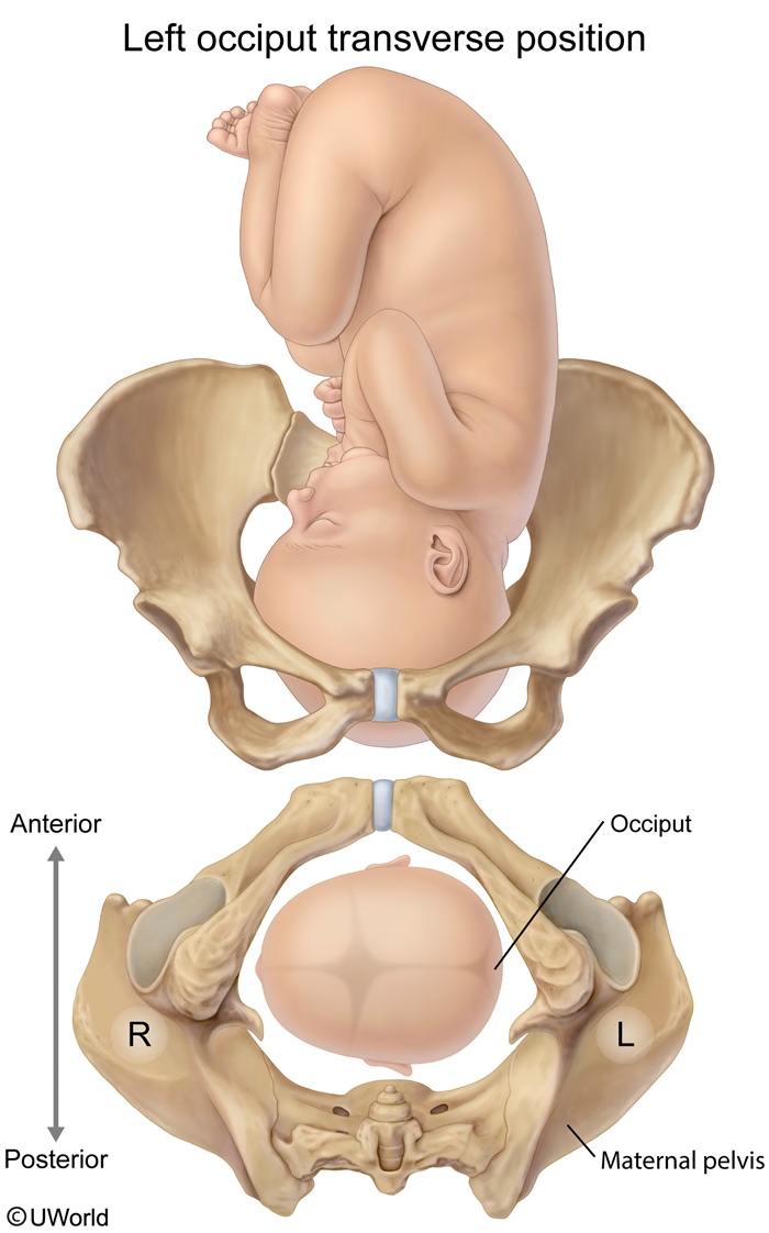 An arrested second stage occurs when there is no fetal descent after pushing for >3 hours in nulliparous patients or >2 hours in multiparous patients. The most common cause of a prolonged or arrested second stage is fetal malposition. The fetal position is the relationship of the fetal presenting part to the maternal pelvis. The optimal fetal position is occiput anterior as it facilitates the cardinal movements of labor. Deviations from this position (eg, occiput transverse, occiput posterior) can cause cephalopelvic disproportion and arrest of the second stage.