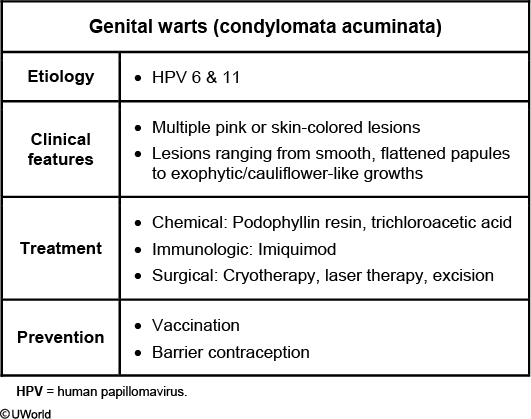 Genital warts (condylomata acuminata) are caused by the human papillomavirus (HPV), the most common sexually transmitted infection in the United States. HPV strains 6 and 11 are most likely to cause the warts, whereas high-risk strains 16 and 18 are associated with high-grade cervical intraepithelial neoplasia and cervical cancer. Internal and/or external vaginal lesions as well as anogenital lesions occur in women. Genital warts appear as clusters of soft, pink or skin-colored lesions. Most lesions are exophytic and cauliflower-like, although some may appear sessile and flat. Genital warts are most often asymptomatic, although pruritus and bleeding from a lesion are possible.