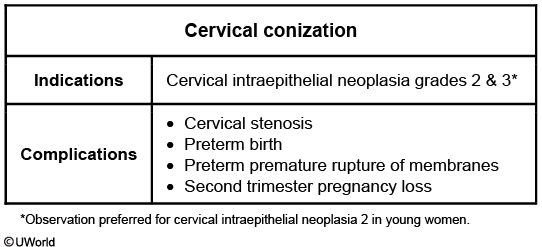 Colposcopy evaluates the cervix and vagina under magnification after application of acetic acid to contrast and identify abnormal (eg, aceto-white changes) from normal cells; abnormal vessels (a sign of high-grade lesions) also become more visible. Cervical neoplasia typically occurs at the transformation zone or squamocolumnar junction. If these areas are not visualized during colposcopy (eg, an "inadequate" colposcopy), an endocervical curettage is performed to evaluate the endocervical canal. Endocervical curettage is an invasive procedure and is deferred during pregnancy due to risk of miscarriage and preterm delivery. Cervical biopsy is performed even in pregnancy if a lesion has high-grade features (eg, abnormal vessels).