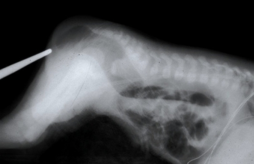 TracheoEsophageal: Catheter with X-ray from nostril to stomach. Coiled up
