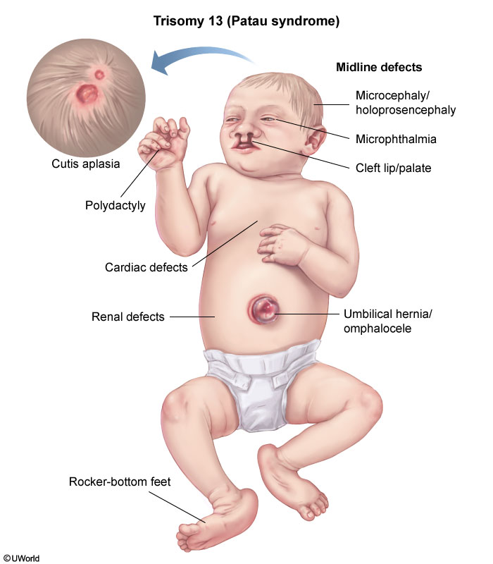 Precordal mesoderm fusion result in catastrophic midline defects, including holoprosencephaly, microcephaly, microphthalmia (small eyes), cleft lip/palate, and omphalocele. Abnormal brain development results in intellectual disability and seizures. Additional abnormalities include polydactyly and cutis aplasia (focal skin defect of the scalp).