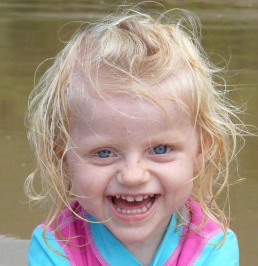 large mouth with tongue protrusion, hypopigmentation with blond hair and pale blue eyes.,