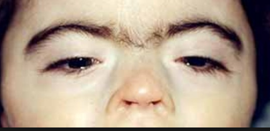 symptoms: Features include bushy eyebrows, hirsutism, limb defects, VSD, and mental retardation.,