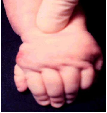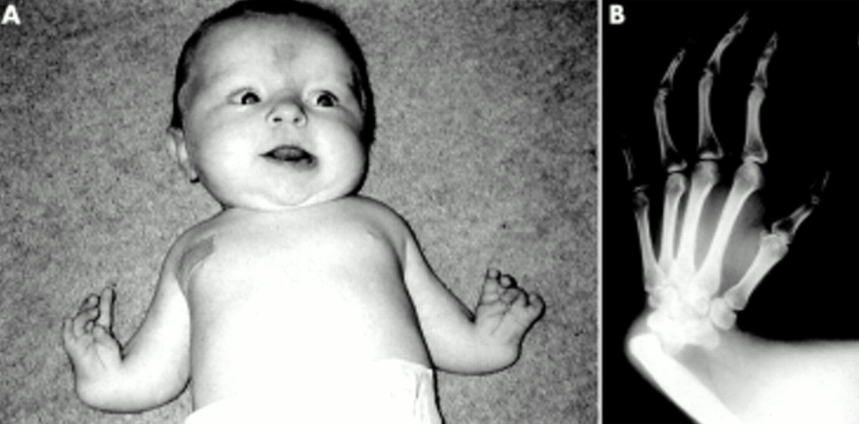 diagnosed in the newborn who demonstrates profound thrombocytopenia, bilateral absence of radius, and abnormally shaped thumbs. (Shortened lower distal arms but with thumbs)