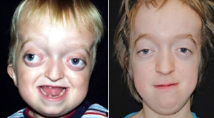 symptoms: craniosynostosis (usually coronal), proptosis, brachycephaly, hypertelorism and strabismus, “beak” nose, midface hypoplasia, and high and narrow palate.,