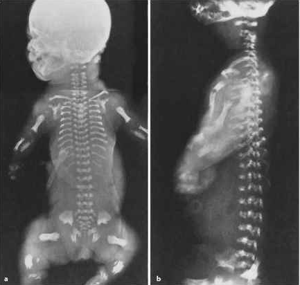 symptoms: short stature, long and narrow thorax, hypoplastic lungs, fibrotic liver, and short limbs. Death is common, a result of pneumonia or asphyxia because of the abnormally shaped thorax.,