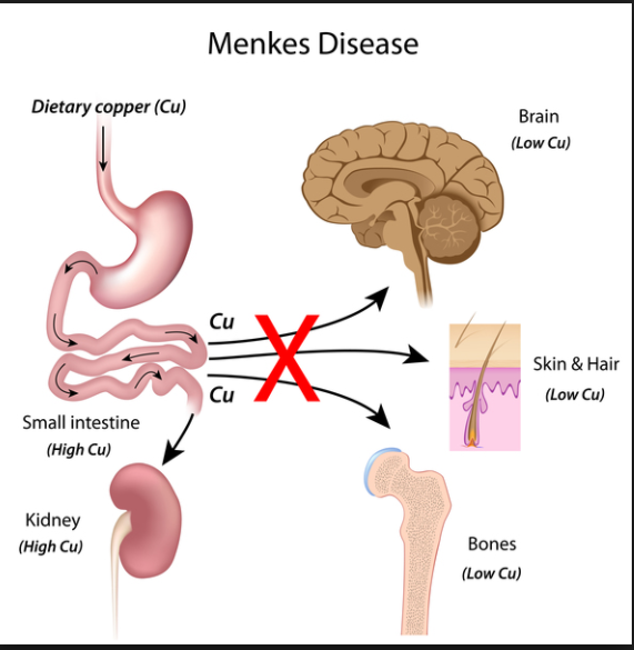 symptoms: presents in the first months of life and includes hypothermia, hypotonia, and myoclonic seizures. These children have chubby, rosy cheeks and kinky, colorless, and friable hair. Severe mental retardation is always seen.