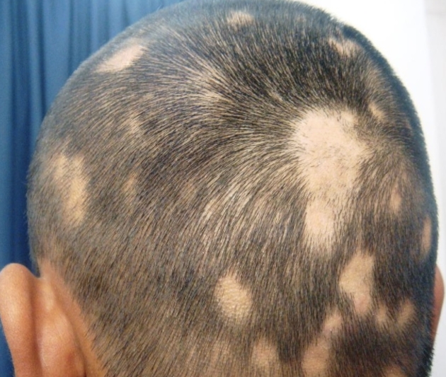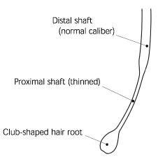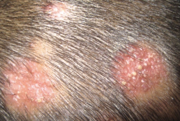 Symptoms: can appear similar to fungal infections, but the hairs near the active lesion often can be extracted with gentle traction resulting in an attenuated or catagen bulb at the termination of the hair shaft (exclamation hair); it does not produce a kerion as shown in the photograph.,