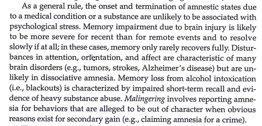 Dissociative amnesia is an inability to recall memories due to psychiatric dissociation, usually surrounding a stressful event. The classic description is a patient who has completely intact memory except amnesia of a traumatic rape experience.