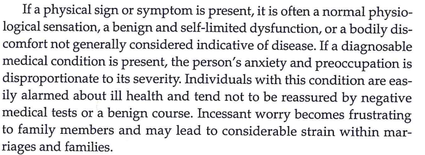 Illness anxiety disorder (formerly hypochondriasis) is characterized by exaggerated concern with health and illness, while symptoms and actual disease are minimal or absent.