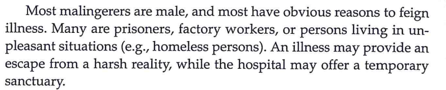 Malingering is the conscious simulation of physical illness for financial or other obvious gain (e.g. avoiding work, obtaining drugs). It is not a psychiatric pathology.