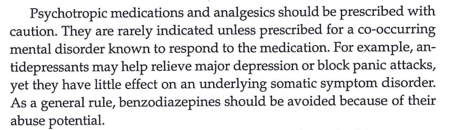 Symptoms are typically more prominent during periods of psychological stress. Optimal management includes regularly scheduled visits with a single provider to develop the physician-patient relationship and monitor the condition, while avoiding unnecessary diagnostic testing and specialist referrals. The physician should focus on discussing the role of psychosocial stressors on somatic symptoms and promoting stress reduction and healthy behaviors (eg, sleep hygiene, relaxation techniques, exercise, diet, return to productive activities).