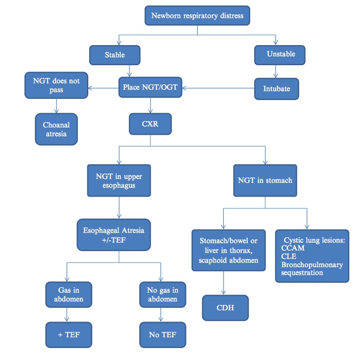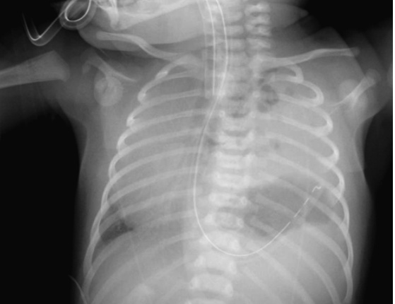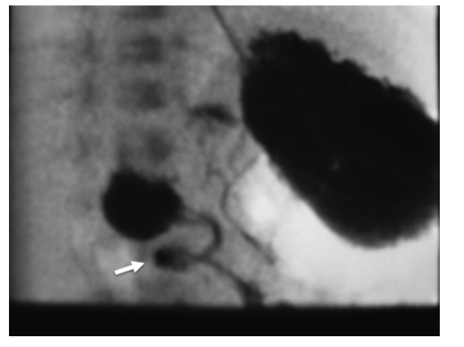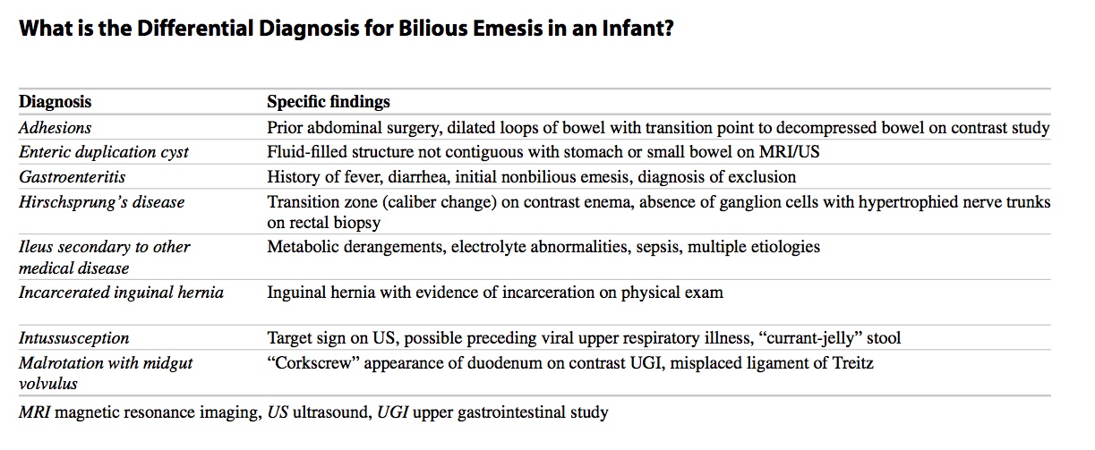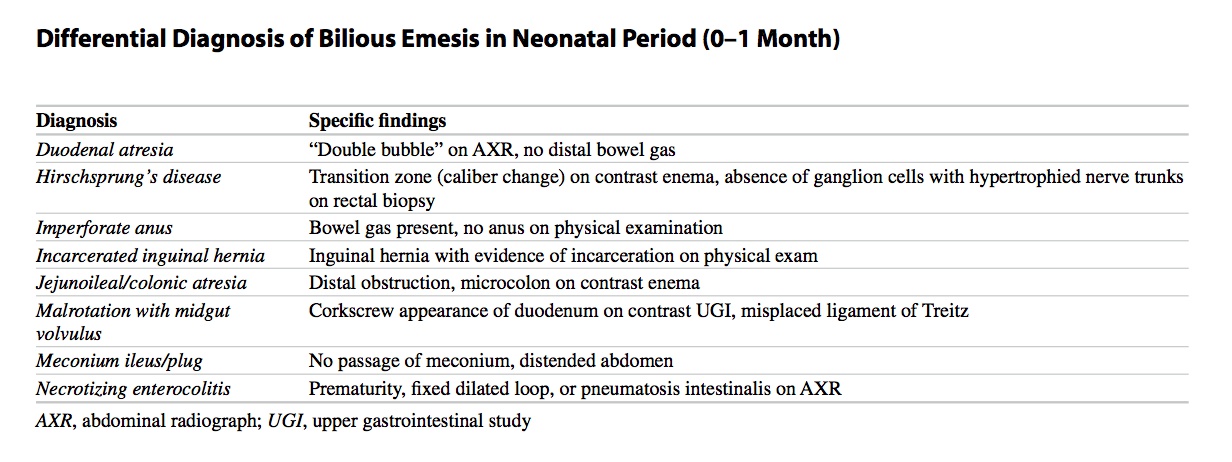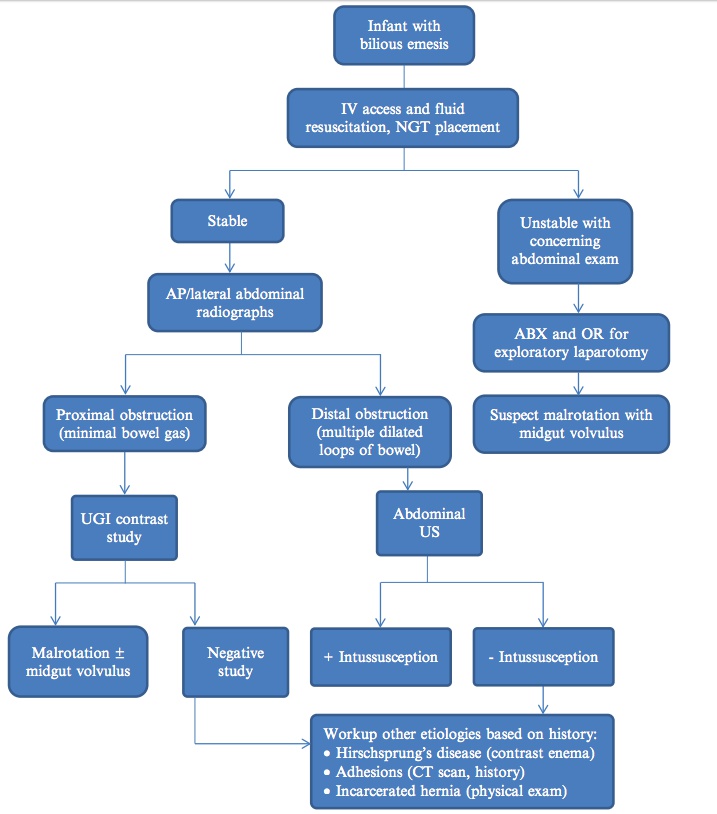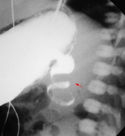 The absence of distal bowel gas in the above radiograph secures the diagnosis of a complete duodenal obstruction, and no further testing is indicated. If any distal gas is seen, an upper gastrointestinal (UGI) contrast study is necessary to rule out malrotation with midgut volvulus, the most life- threatening condition. The UGI contrast study may also be helpful in diagnosing other etiologies of partial duodenal obstruction.