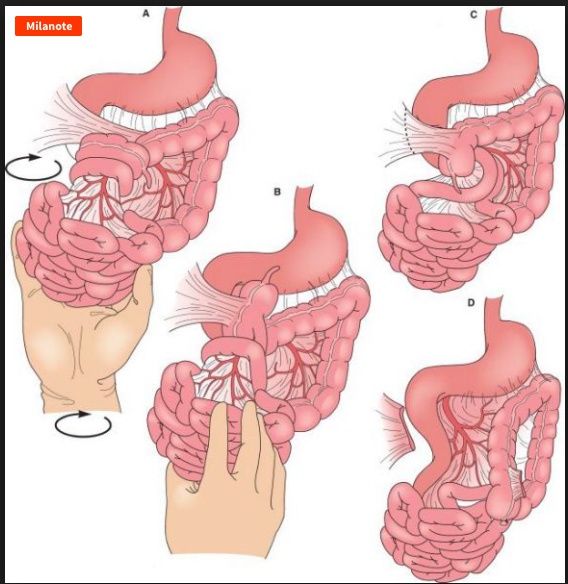 During embryologic development of the midgut, the bowel lengthens, herniates into a U-shaped (around 33 days) loop into the base of the umbilical cord and rotates around the SMA axis 270° counterclockwise (after 44 days). It then reenters the abdomen and undergoes fixation.