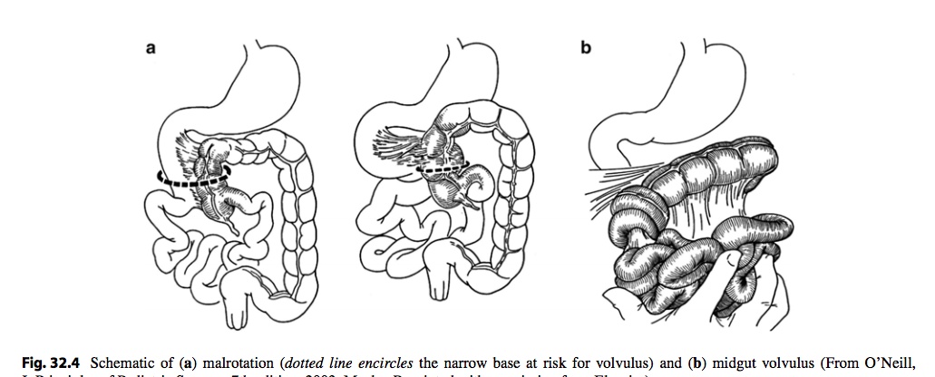 Malrotation is defined as a failure of normal rotation of any portion of the gastrointestinal tract. It also implies abnormal fixation, which is the predisposing factor for the development of a volvulus.