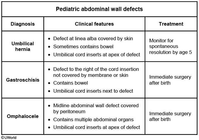 An umbilical hernia is due to an incomplete closure of the abdominal muscles around the umbilical ring at birth. It is most commonly associated with African-American race, premature birth, Ehlers-Danlos syndrome, Beckwith-Wiedemann syndrome, and hypothyroidism. Physical examination shows a soft, non-tender bulge covered by skin that protrudes during crying, coughing, or straining. The hernia may contain omentum or portions of the small intestine. Most umbilical hernias are reduced easily through the umbilical ring with very low risk of incarceration and strangulation.